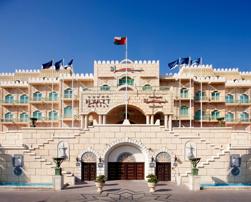 Nestled along the pristine shores of Shatti Al Qurum, Grand Hyatt Muscat is a luxurious 5-star resort that beautifully combines Arabian elegance with contemporary comfort. Overlooking the stunning Gulf of Oman and framed by the majestic Hajar Mountains, the hotel offers an unforgettable experience for both leisure and business travelers. Its spacious rooms and suites reflect traditional Omani design with modern amenities, while its diverse dining options feature international cuisines and local delicacies. Guests can unwind by the expansive outdoor pool, stroll along the private beach, or rejuvenate at the fitness and wellness center.